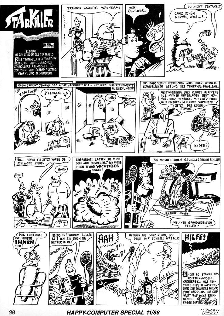 Am Schluß wird Starkiller so wundervoll verschnappt -- äh, verschleppt, daß wir eigentlich Ridley Scotts Segen haben sollten. Vor lauter Alien-Tentakel-Spannung haben wir's allerdings nicht geschafft, auf der ganzen Seite auch nur einen Computerspiele-Insidergag unterzubringen. Dafür gibt's im Endtext die kleinsten Trantor-Nebenpointe der Starkiller-Geschichte ("brennend?"). Bestes Zitat ist für mich aber "Du nicht Tentakel?", gefolgt von "Blödsinn! Warum sollte es? Ich bin doch ein netter Kerl...".